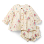 The Harper Bloomer Set in Floral Bouquet is as charming as it is comfortable. Featuring a soft, floral-printed top paired with matching bloomers, this set is perfect for warm days and special moments alike. With its sweet silhouette and breathable fabric, it's an easy favorite for both style and play.